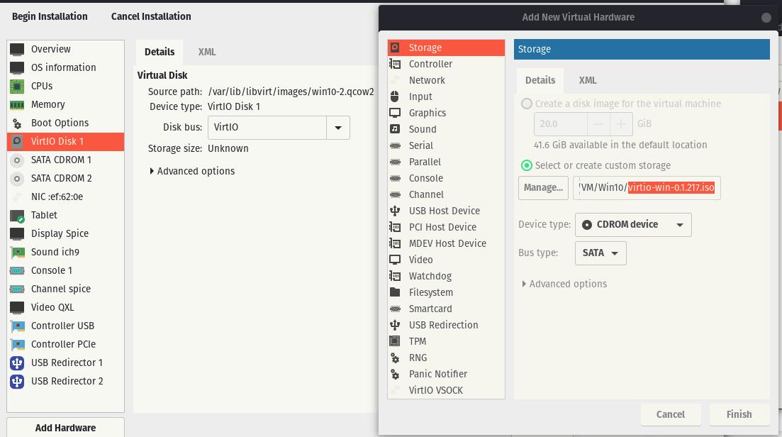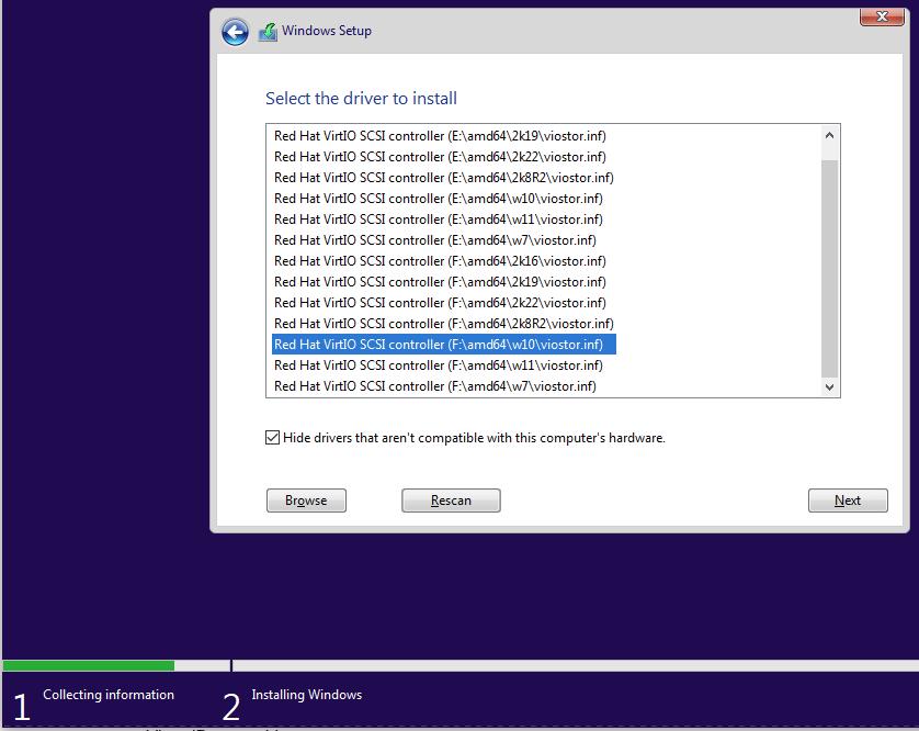 During the windows install process, select custom install. Select load driver and go ahead and select the E:\amd\w10\viostor.inf controller from the virtio CD we added in the previous step. Now you should be able to select the new disk image as the windows install location.