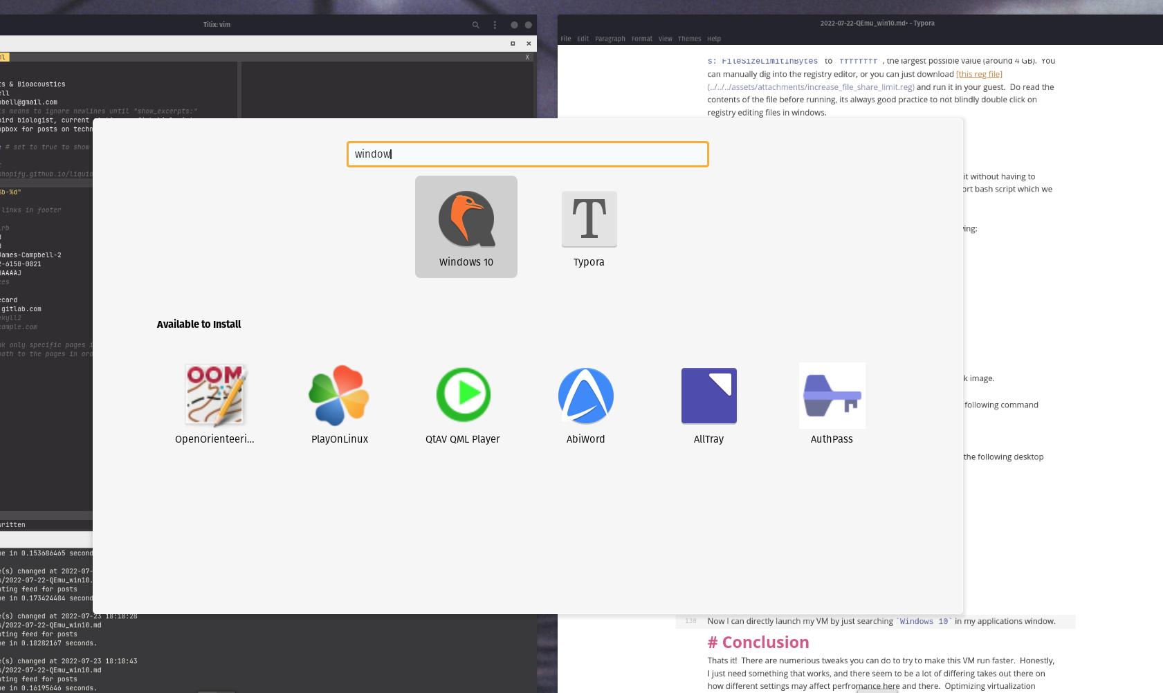 I’ve been faithfully running VirtualBox for my Windows 10 VMs for years… until last week. A kernel update on Pop!_OS somehow broke my Windows 10 VMs across both my machines, causing frequent crashes until the disk images finally corrupted and wouldn’t boot anymore. I took this as a sign that it’s time to finally switch over to QEmu as my go-to VM platform.