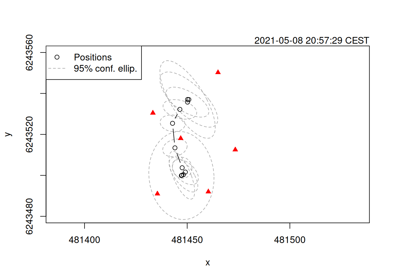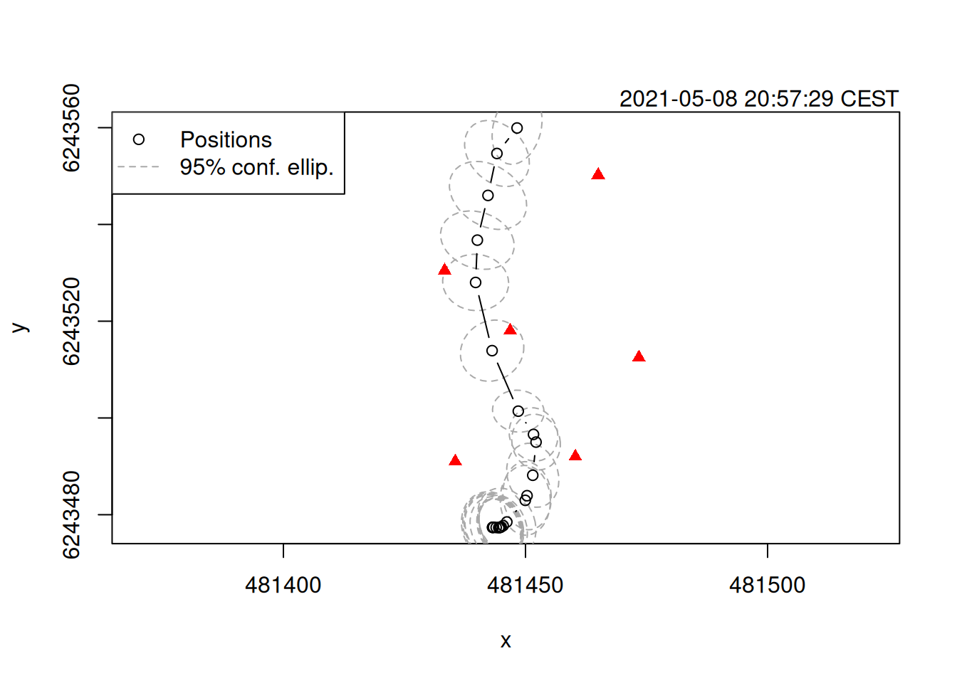 plot(track_tdoa, xlim = c(481420, 481500), ylim = c(6243480, 6243560))